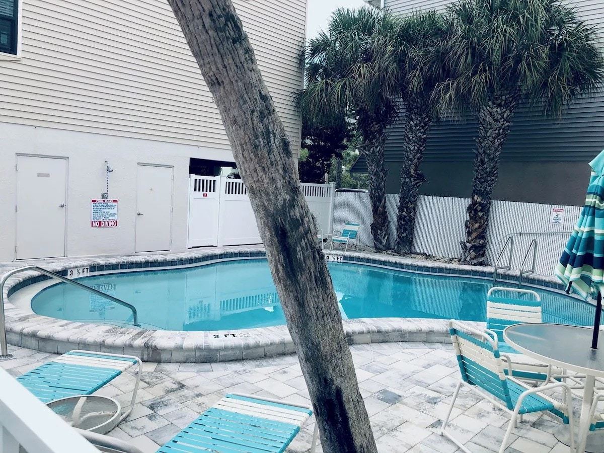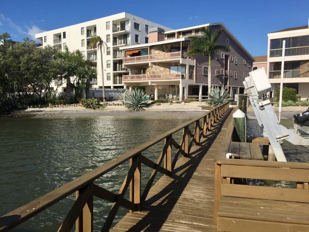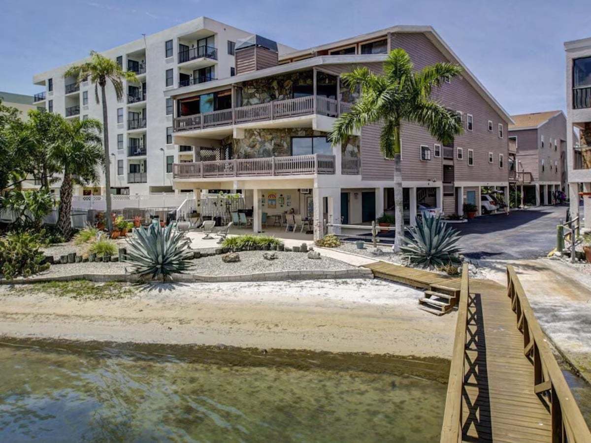 Spacious 2200+ sq ft Key West-style condo with a Gulf of Mexico view from your balcony. Sleeps 8 with 3 full baths, private balcony, heated pool, boat ramp, fishing dock, and 2 kayaks. Enjoy a fully equipped gourmet kitchen, vaulted ceilings, Tempur-Pedic beds, and flatscreen TVs in every room. Large loft with queen bed and private bath. Walking distance to restaurants & bars. Free Wi-Fi & parking. Perfect for family vacations or group getaways!